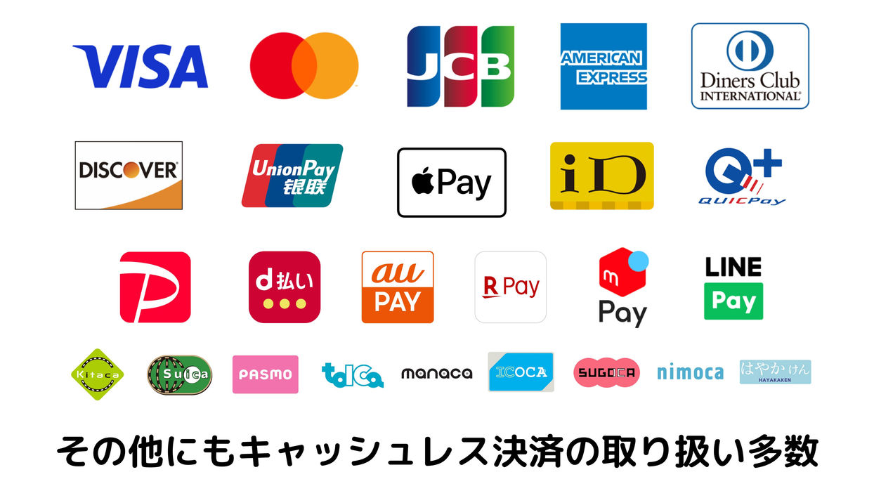 現金、各種クレジットカードブランド、iD、QUIC Pay、PayPay、d払い、auPAYなど